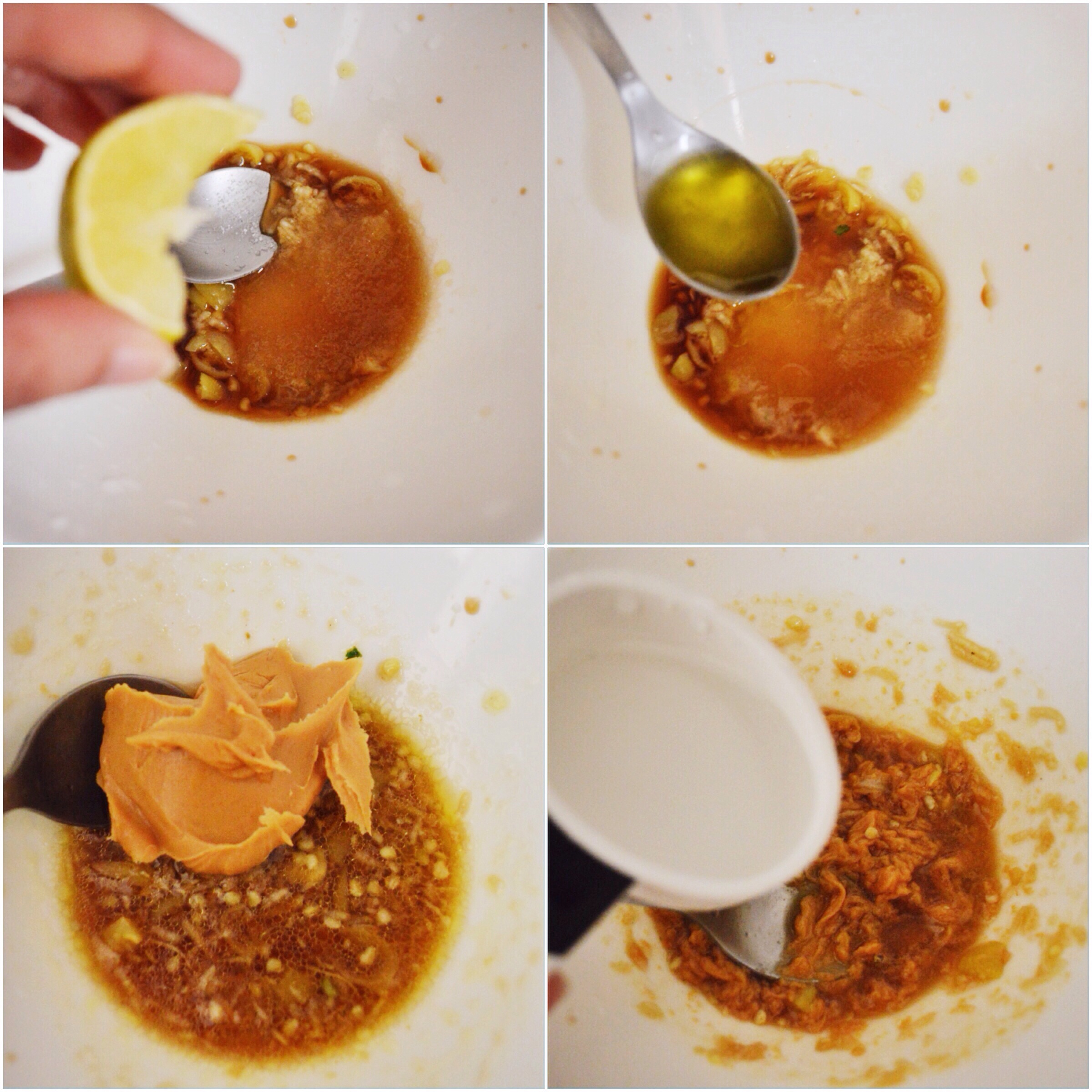 فرم كل من الثوم، الفلفل الحار، الفلفل وتركهم علي جانب حتي يتم مزجهم مع صلصة الصويا والخل والسكر والليمون والزيت وصلصة السمك لخفق هذه المكونات معاً حتي تصبح ناعمة .