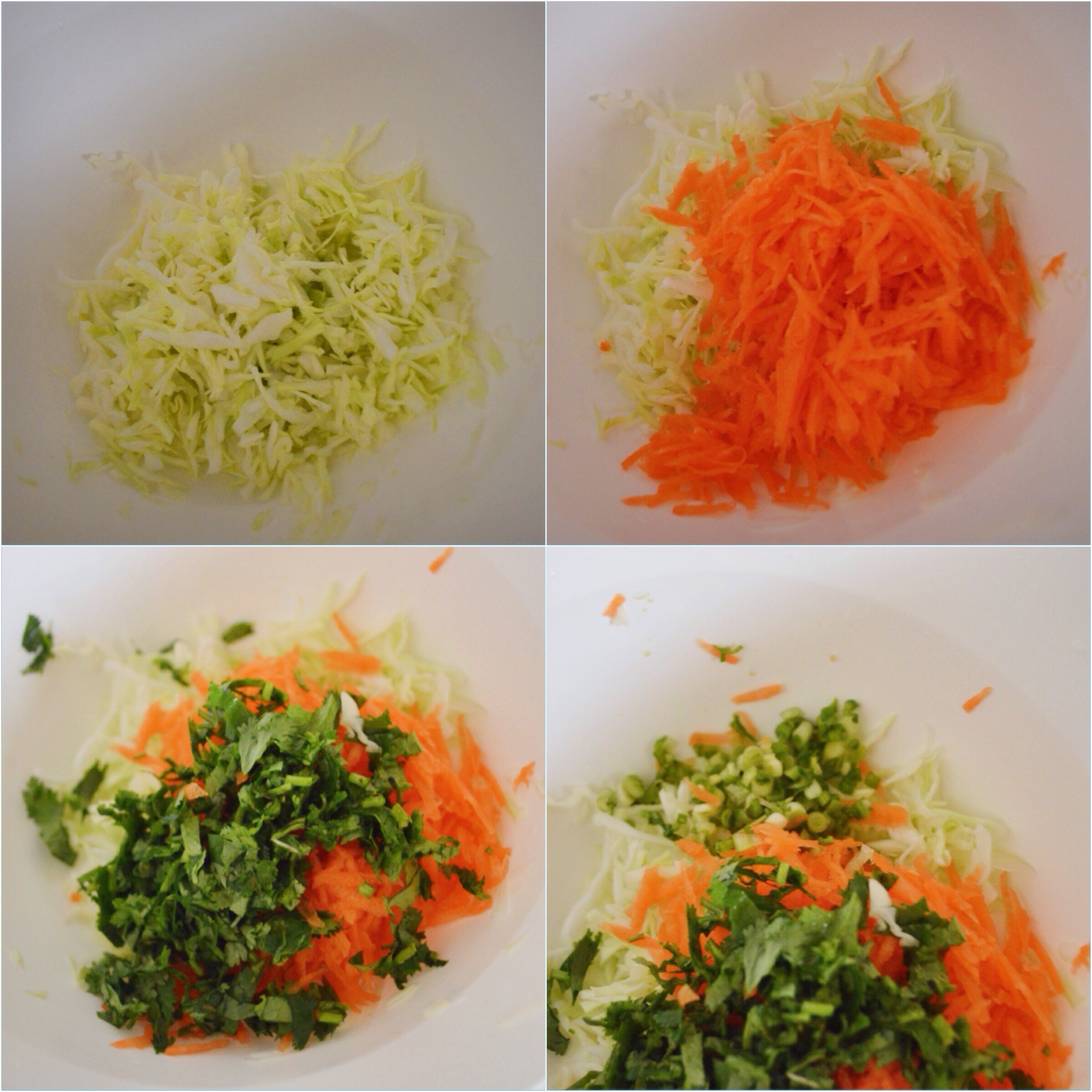 والجمع بين الكزبرة والبصل الأخضر لتقطيعهم إلي أجزاء صغيرة لوضعهم معاً في وعاء خلط .